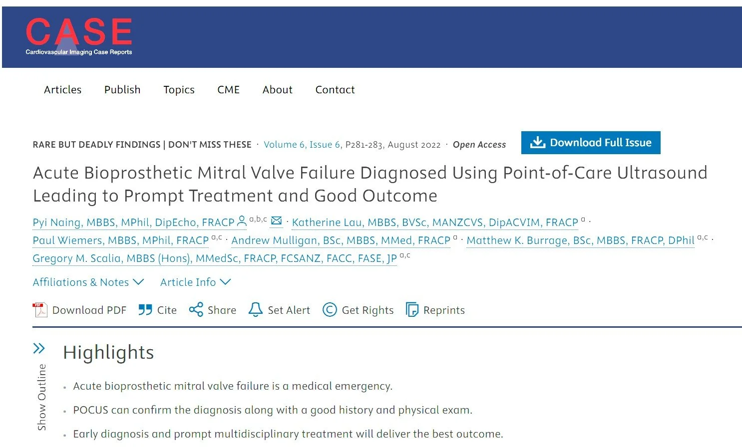 Cardiovascular Imaging Case Reports titled 'Acute Bioprosthetic Mitral Valve Failure Diagnosed Using Point-of-Care Ultrasound Leading to Prompt Treatment and Good Outcome.'