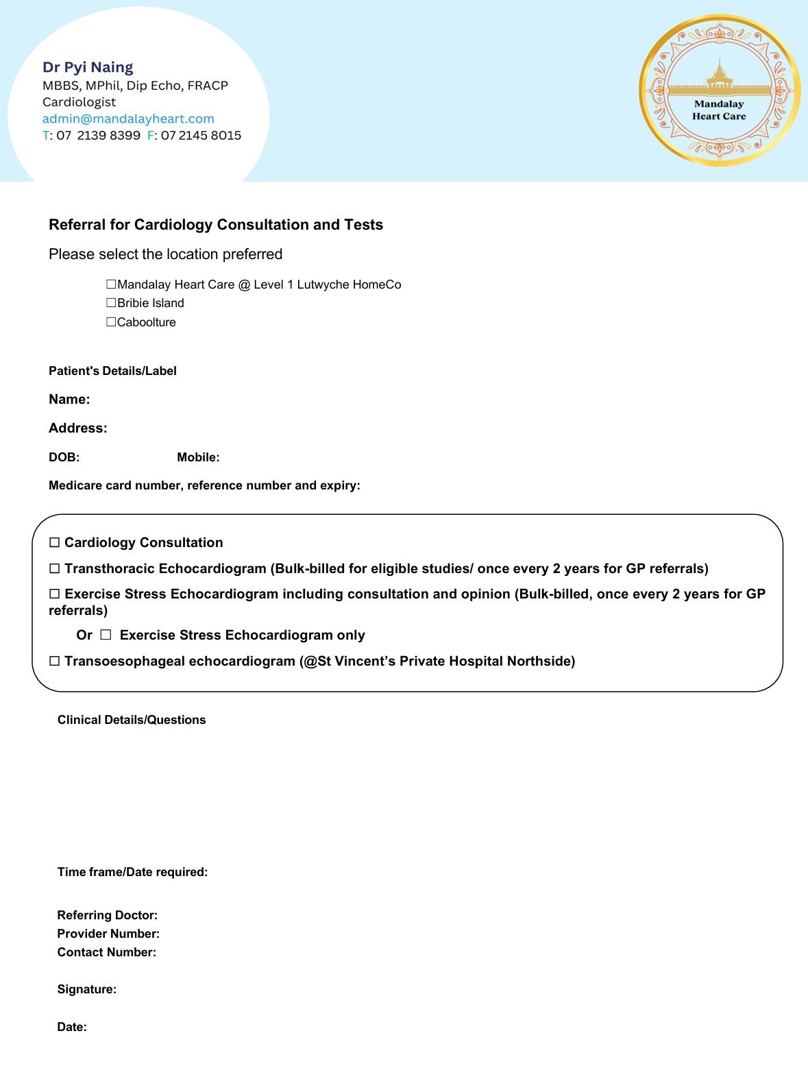 Please send consultation and echocardiogram referrals via Medical‑Objects from your clinical software (e.g. Best Practice) using my provider number below. This ensures a secure, efficient, and streamlined referral process.