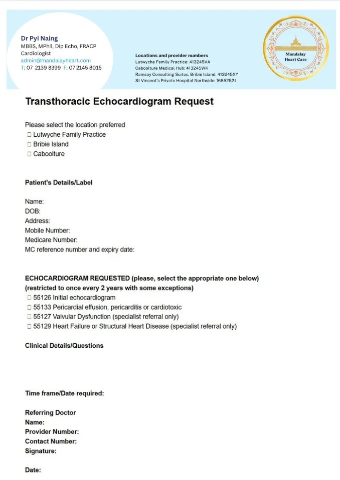 Please send consultation and echocardiogram referrals via Medical‑Objects from your clinical software using my provider number below. This ensures a secure, efficient, and streamlined referral process.